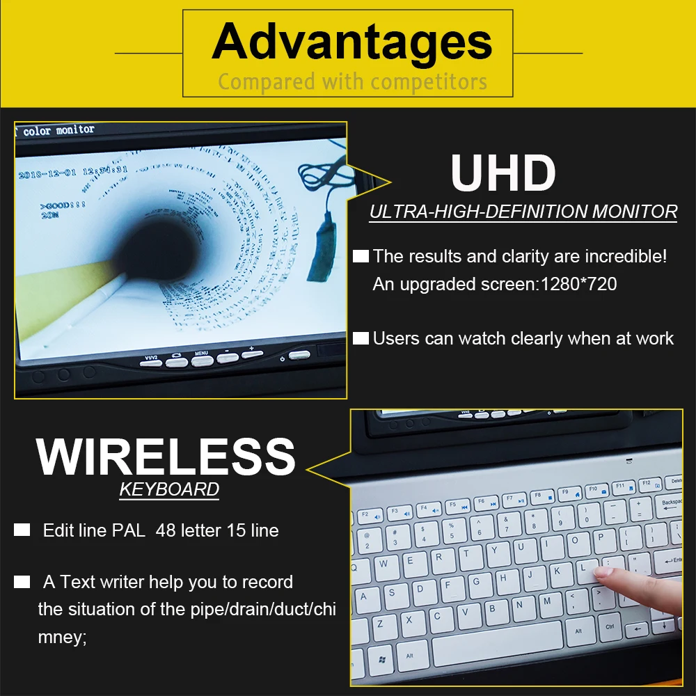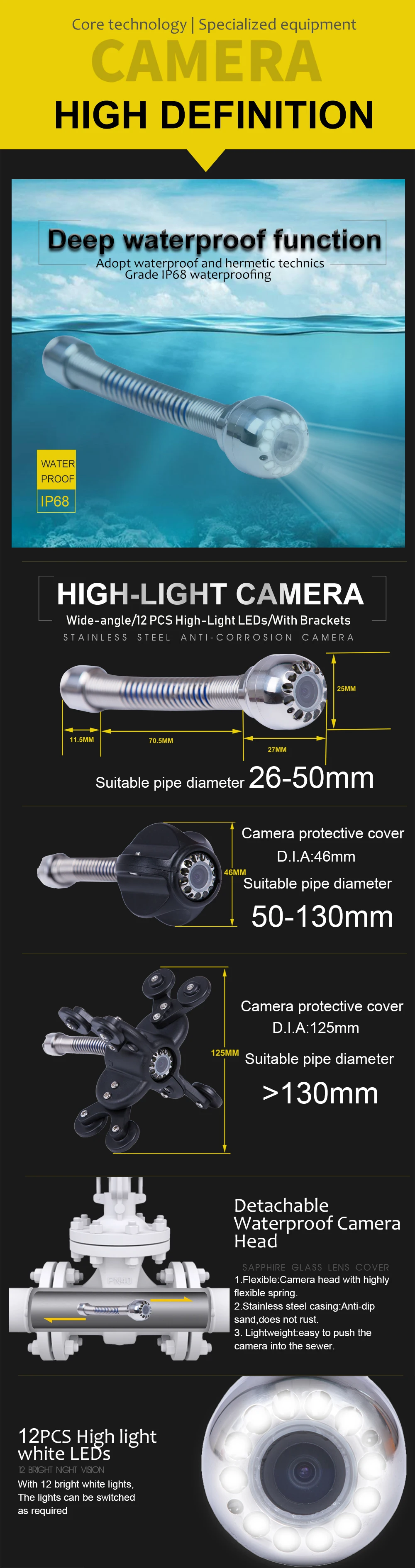 Drain Pipe/Sewer Pipeline Inspection Snake Camera can be used under floors, inside walls, attics, gutters and roof even and can even be used to view mold and water damage.Pipe Sewer Industrial Endoscope Pipe Video Inspection System also applicable to air-conditioner pipe, vacuum pipeline,Sunken pipe etc.It is convenient to use and avoid danger at the utmost.
